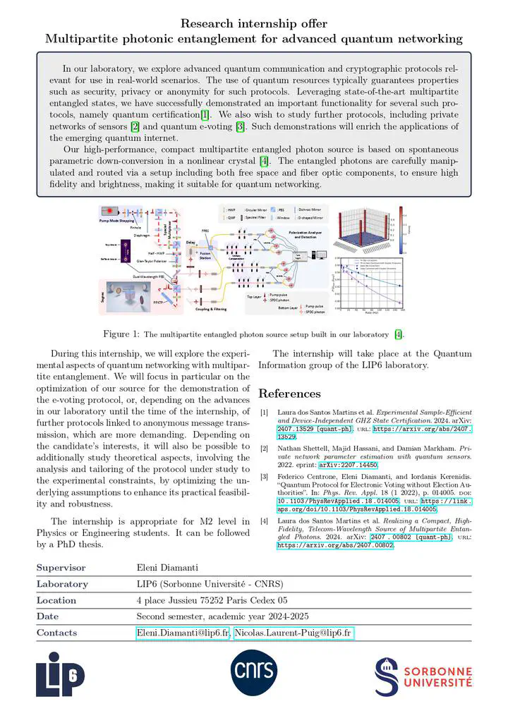 Internship offer Multipartite photonic entanglement for advanced quantum networking Dec 2, 2024 Contacts Eleni Diamanti Eleni.Diamanti@lip6.fr Nicolas Laurent-Puig Nicolas.Laurent-Puig@lip6.fr